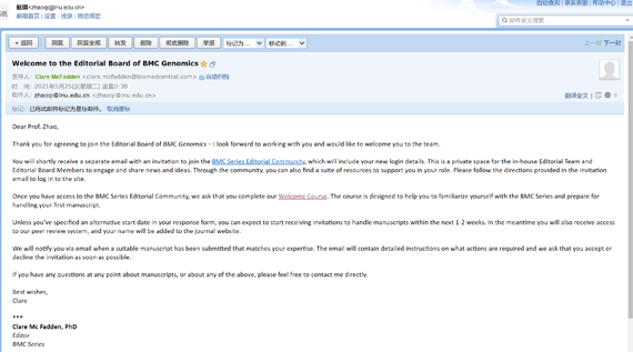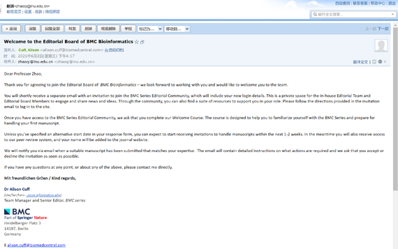 近日,荣耀体育app最新版下载计算机与软件工程学院教授赵琪收到BMC出版集团Dylan Smith博士邀请,受邀分别担任BMC Genomics和BMC Bioinformatics编委。