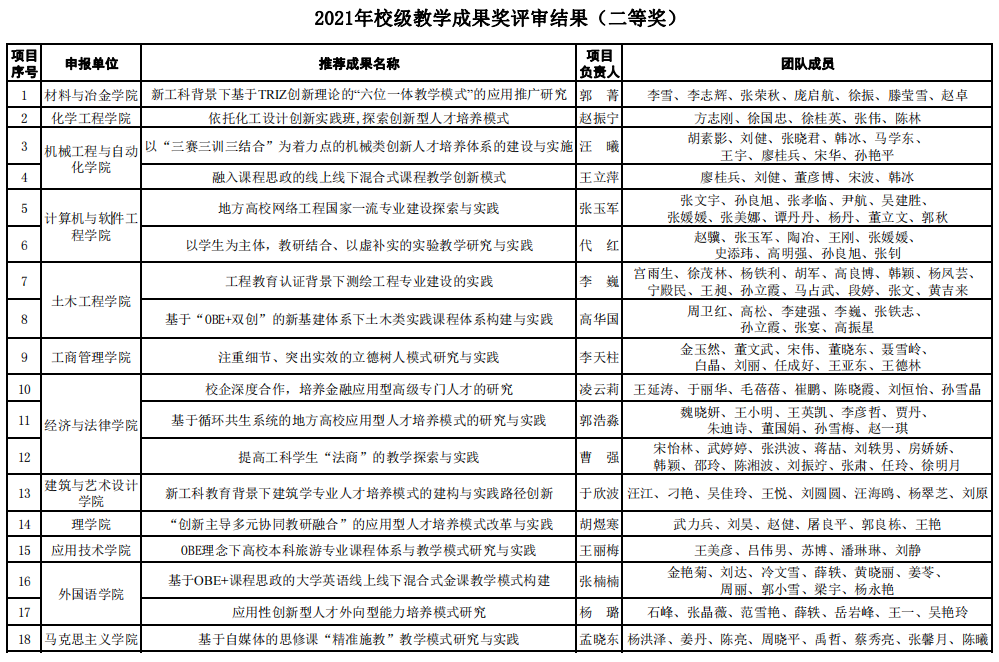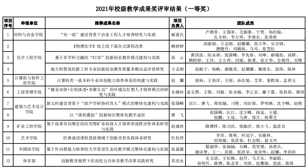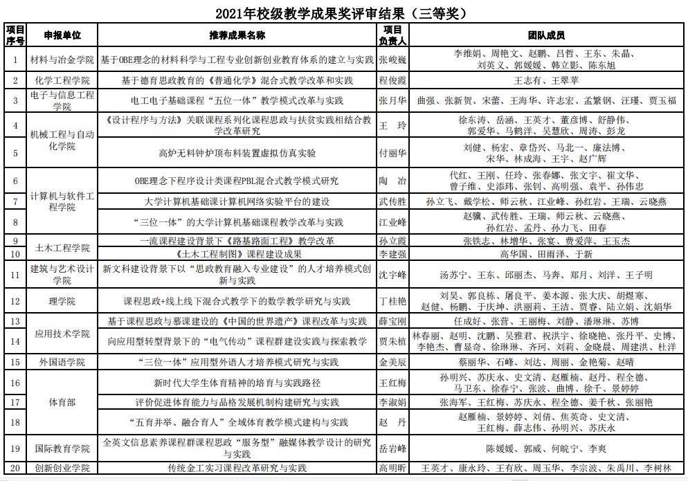 根据《关于开展荣耀体育app最新版下载2021年教学成果奖评选工作的通知》(荣耀体育(中国)教发【2021】35号)相关工作安排,各教学单位推荐参评2021年校级教学成果奖共62项。经专家评审,学校研究决定2021年校级教学成果奖获奖项目为50项,其中一等奖12项,二等奖18项,三等奖20项。获奖名单公布如下:
