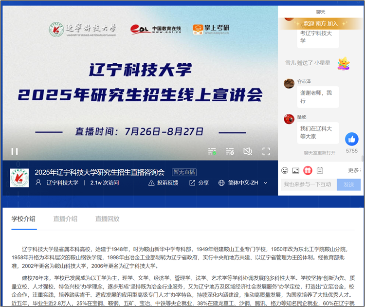 8月8日上午,荣耀体育app最新版下载材料与冶金学院2025年研究生招生线上直播宣讲会圆满完成,学院副院长庞启航担任直播宣讲主持人。