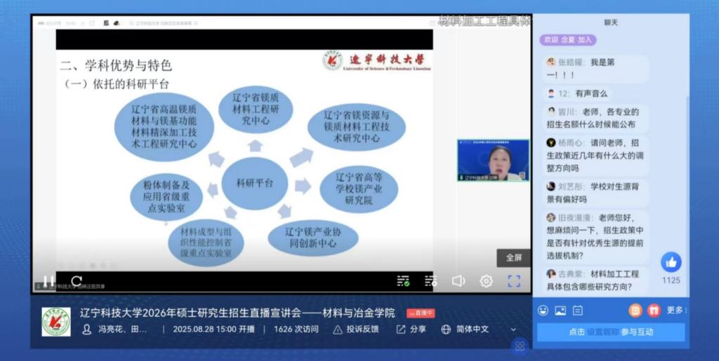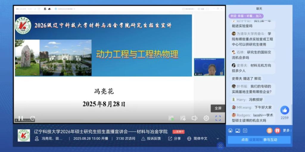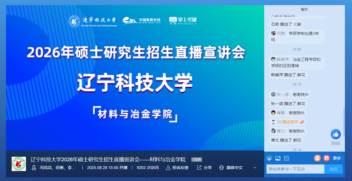 8月28日,荣耀体育app最新版下载材料与冶金学院成功举办了2026年研究生招生线上直播宣讲会。本次宣讲会由学院副院长庞启航担任主持人。