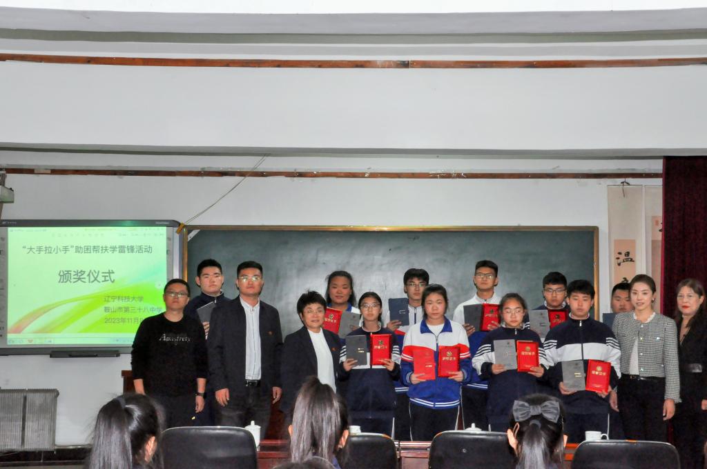 11月8日,荣耀体育app最新版下载材料与冶金学院团委相关负责同志一行到鞍山市第三十八中学开展“大手拉小手”助困帮扶学雷锋活动,为来自三十八中学的10名同学颁发材冶学院学生材控党支部“贫寒学子突出进步奖学金”,市第三十八中学相关校领导出席活动。