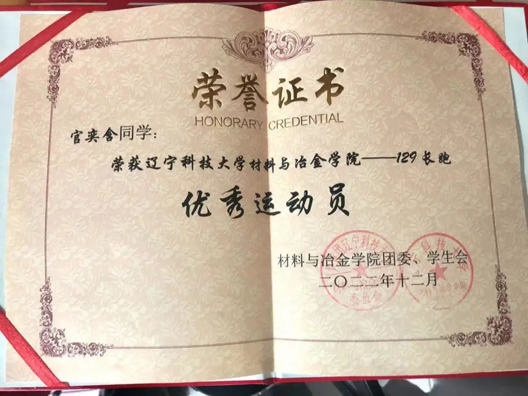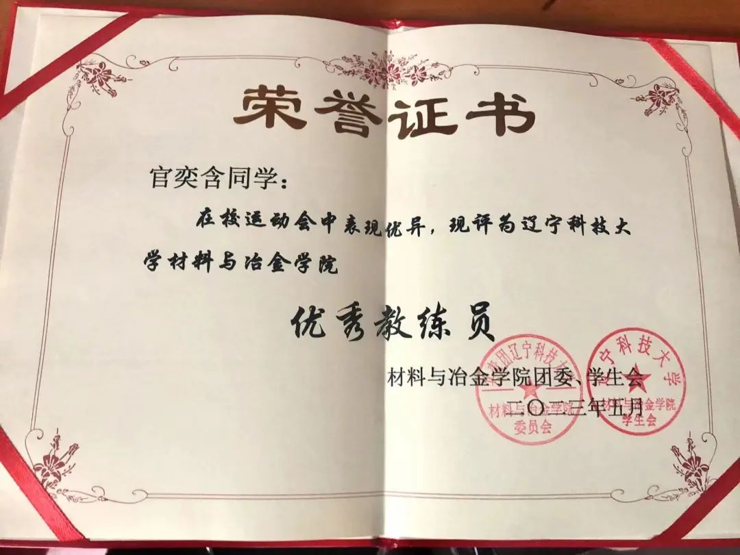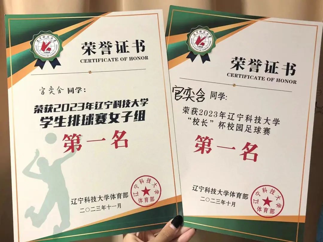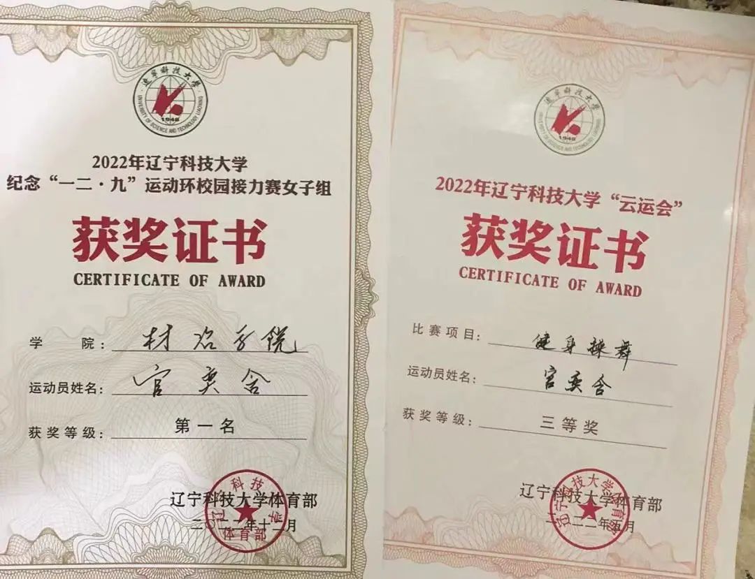2023年:第五十一届荣耀体育app最新版下载校园运动会女子跳高校级第三名、荣耀体育app最新版下载材料与冶金学院优秀运动员、荣耀体育app最新版下载材料与冶金学院优秀教练员、荣耀体育app最新版下载“校长”杯校园足球赛校级第一名、荣耀体育app最新版下载学生排球赛校级第一名、三级社会体育指导员