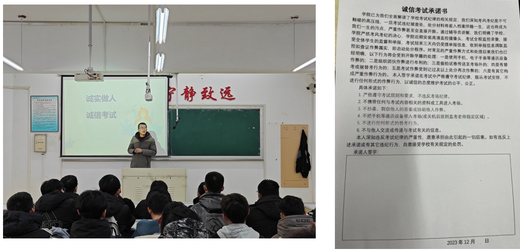 各专业班级通过主题班会等方式开展诚信考试宣传教育,辅导员带领全体同学认真学习了《荣耀体育app最新版下载学生考试违纪处理细则》等文件,并通报了以往因考试作弊受到处分的案例、严重后果。帮助同学们从思想上认识到诚信考试的重要性和必要性,全体学生签署了《诚信考试承诺书》,承诺依靠自己的努力学习取得优异成绩。