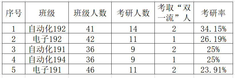 2023年全国硕士研究生录取工作基本落下帷幕,电信学院2019级学生考研成绩捷报频传。2019级毕业生共576人,其中113人考取硕士研究生,上线录取率再创新高,达到19.62%,比去年增加1.1%。考取985、211名校11人,占全部录取人数的9.73%。