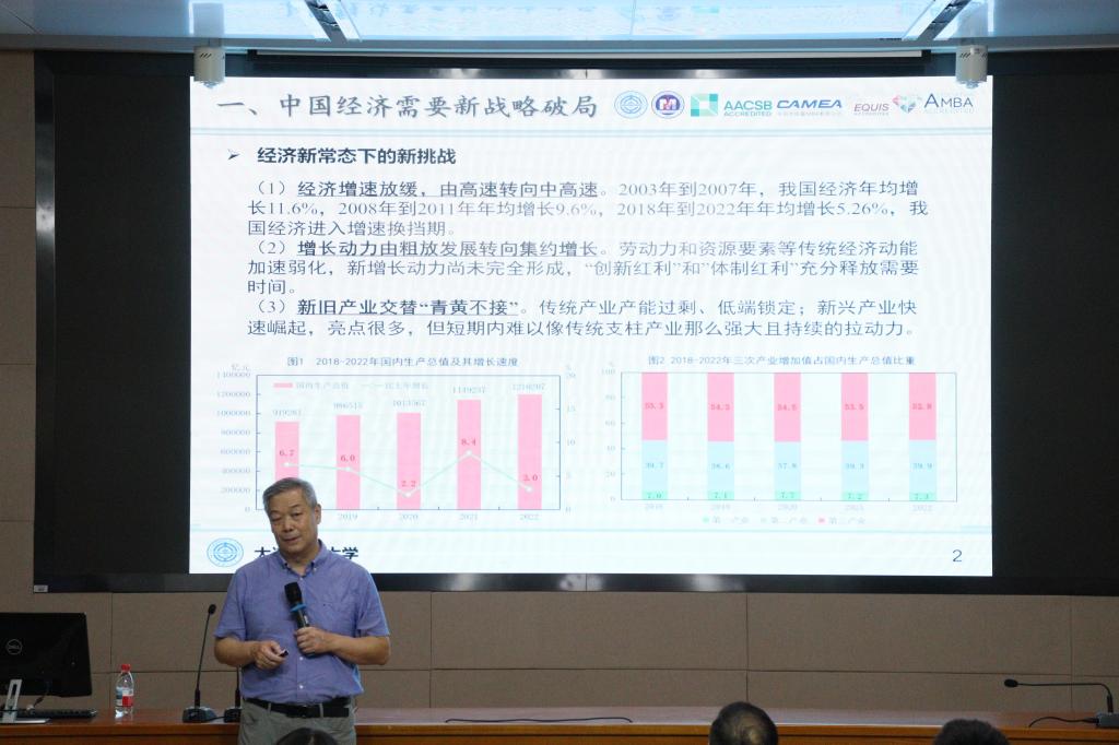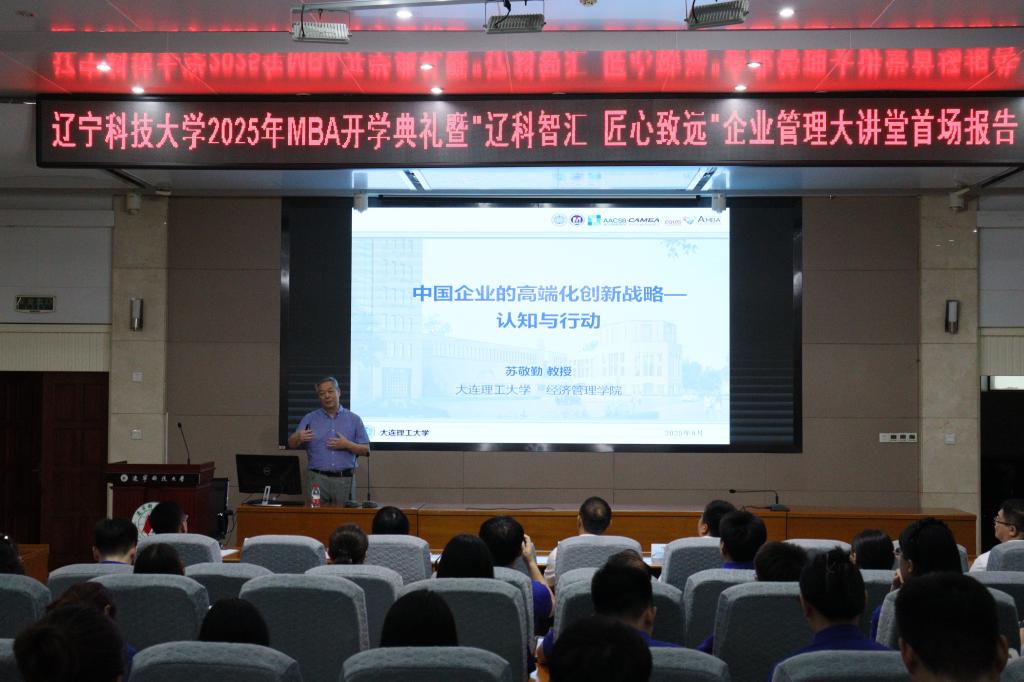 2025年8月30日,荣耀体育app最新版下载工商管理学院迎来了一场思想盛宴——MBA2025级开学典礼暨“辽科智汇·匠心致远”企业管理大讲堂正式启动。首场报告特邀国家级领军人才、大连理工大学苏敬勤教授作题为《中国企业的高端化战略—从认知到行动》的专题演讲。讲座由工商管理学院院长金玉然教授主持,2025级全体MBA学员及部分教师参与本次论坛。