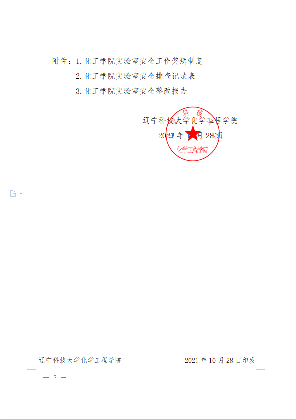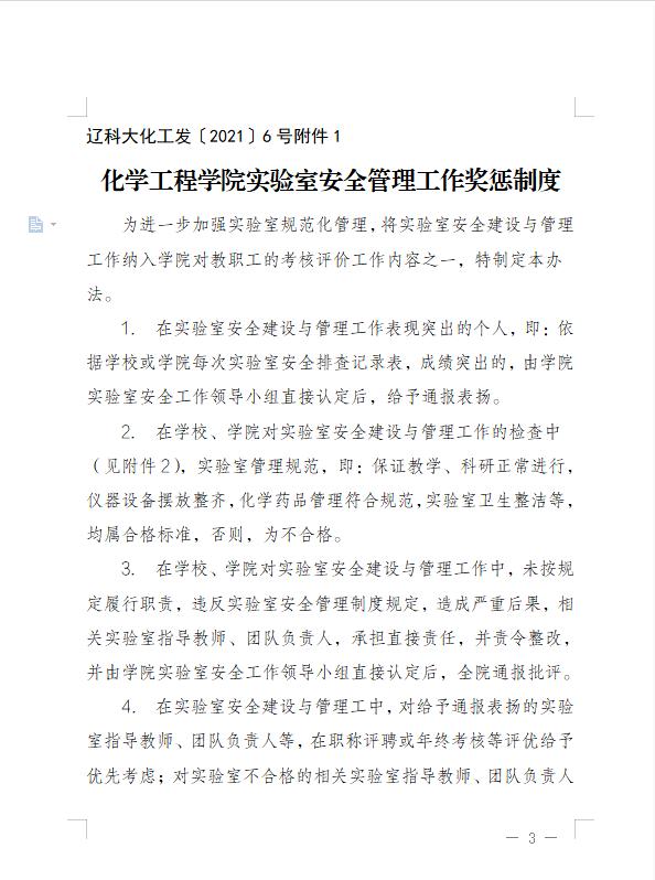 荣耀体育(中国)化工发〔2021〕6号 关于印发化学工程学院《化工学院实验室安全管理奖惩制度》的通知.doc