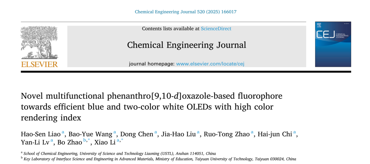日,化学工程学院辽宁省功能材料重点实验室李晓教授团队在有机光电材料领域取得重要进展。相关成果以题为“Novel multifunctional phenanthro[9,10-d]oxazole-based fluorophore towards efficient blue and two-color white OLEDs with high color rendering index”发表在国际权威期刊《Chemical Engineering Journal》(中科院一区TOP,影响因子13.3)。论文第一作者为化工2022级博士研究生廖浩森,通讯作者为李晓教授,我校为第一完成单位。