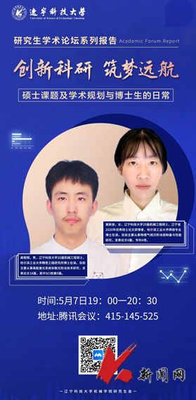5月7日,荣耀体育app最新版下载机械工程与自动化学院举办“创新科研,筑梦远航”研究生学术论坛第一期线上活动,特邀请哈尔滨工业大学精密工程研究所高敬翔博士、先进焊接与连接国家重点实验室黄新放博士,分享博士期间的科研心得和求学体会,学院2020级和2021级研究生参加论坛交流。