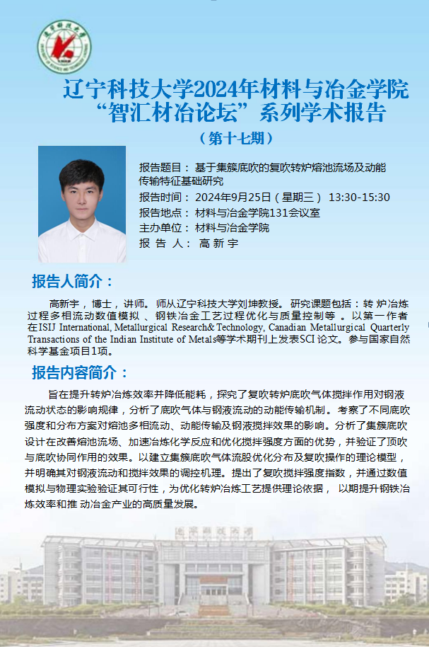 学术预告:基于集簇底吹的复吹转炉熔池流场及动能传输特征基础研究