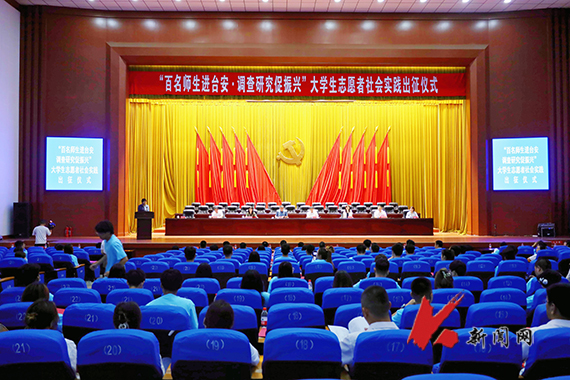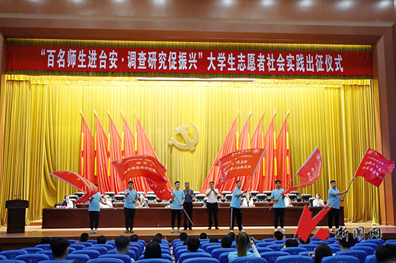7月11日,荣耀体育app最新版下载“百名师生进台安·调查研究促振兴”暑期专项社会实践出征仪式在鞍山台安县会堂隆重举行。荣耀体育(中国)党委常委、副校长王锡钢出席仪式并讲话。辽宁省教育厅思政处同志,台安县委书记苑振超,台安县委组织部部长辛德,台安县委常委、副县长潘军勇等和140余名荣耀体育(中国)师生参加出征仪式。