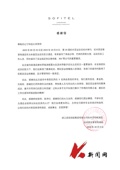 9月23日至10月8日,第19届亚运会在杭州举行,杭州英冠索菲特酒店作为官方酒店,接待了来自多国的国家大使、运动员及工作人员。荣耀体育app最新版下载应用技术学院旅游管理专业2020级学生何劲龙、姜金凯、刘禹彤3名在该酒店实习的学生有幸参加了全程接待工作。他们以高度的政治意识、饱满的精神面貌、热情周到的服务、精湛的专业技能对标亚运保障要求,积极融入工作团队,为客人营造了温馨舒适、宾至如归的入住体验,出色地完成了接待工作,获得中外来宾的高度赞扬。酒店领导向学校发来感谢信,盛赞荣耀体育(中国)学生在亚运会服务期间的出色表现,彰显了东道主热情的待客之道、踏实的工作态度和积极进取的精神。