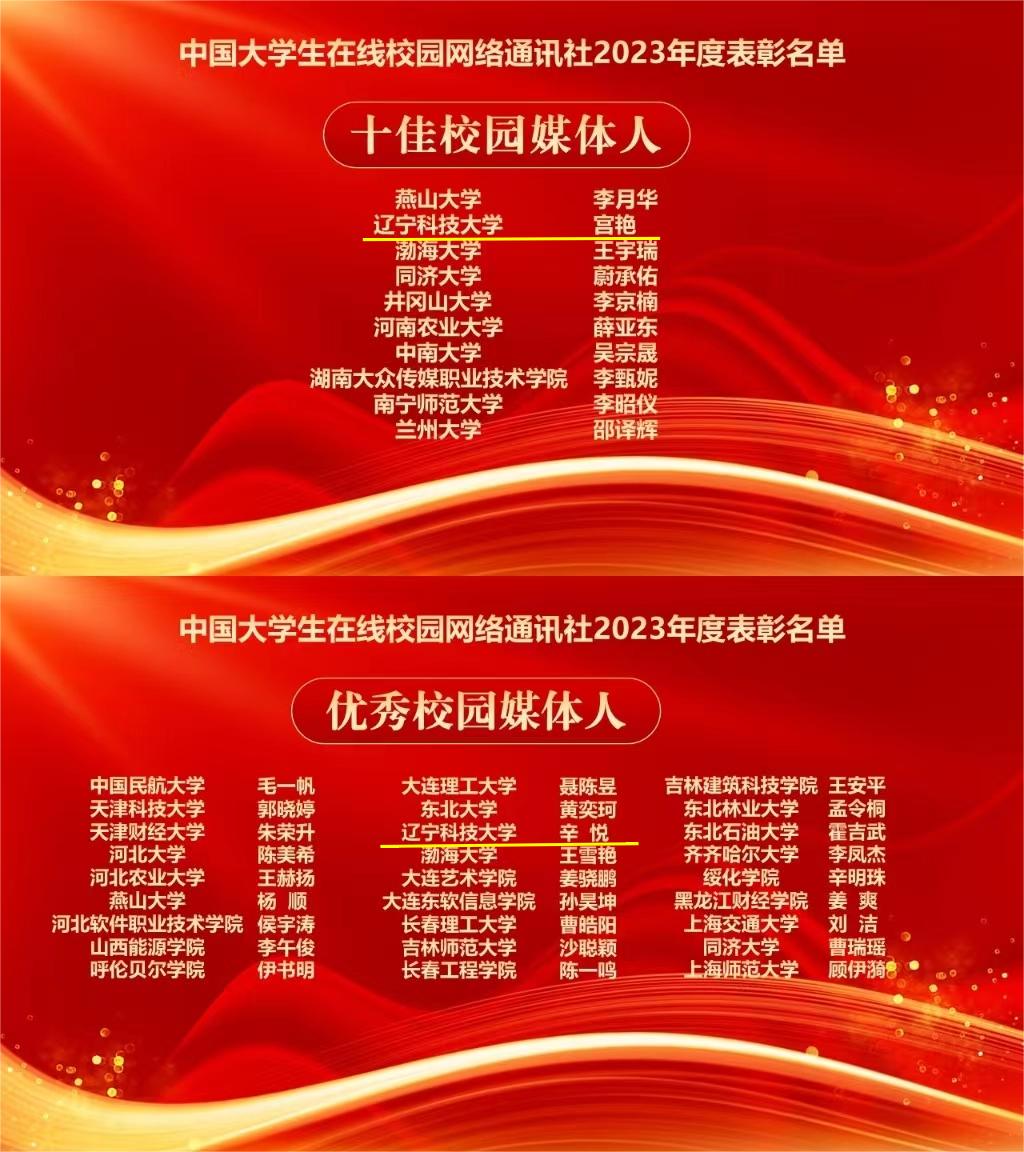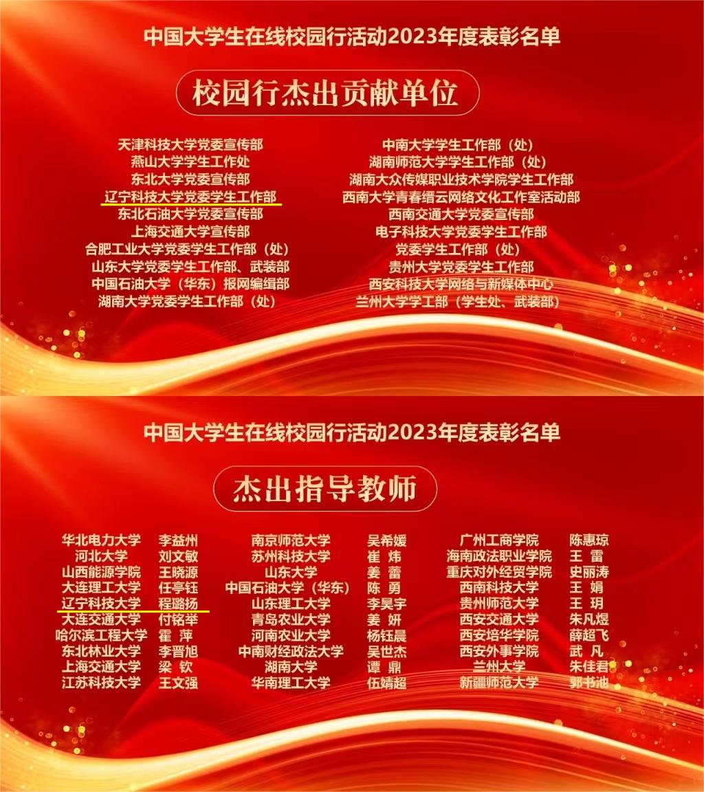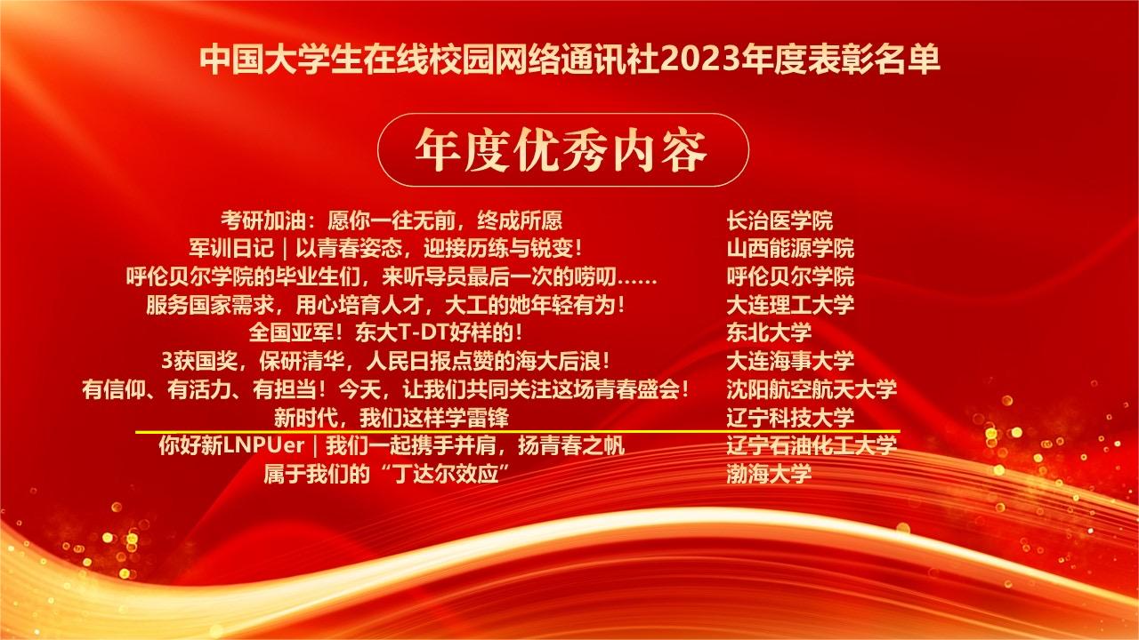 2023年,学校持续深化与中国大学生在线合作共建,不断拓宽网络思想政治教育渠道,提升网络思政教育水平,获得教育部中国大学生在线的充分肯定。此次表彰中,荣耀体育app最新版下载党委学生工作部获评“校园行杰出贡献单位”,荣耀体育app最新版下载网通站获评教育部中国大学生在线“十佳校网通站”,程璐扬获评“校网通十佳指导教师”“校园行杰出指导教师”,校网通站学生宫艳获评“十佳校园媒体人”、辛悦获评“优秀校园媒体人”,“新时代,我们这样学雷锋”获评“年度优秀内容奖”。