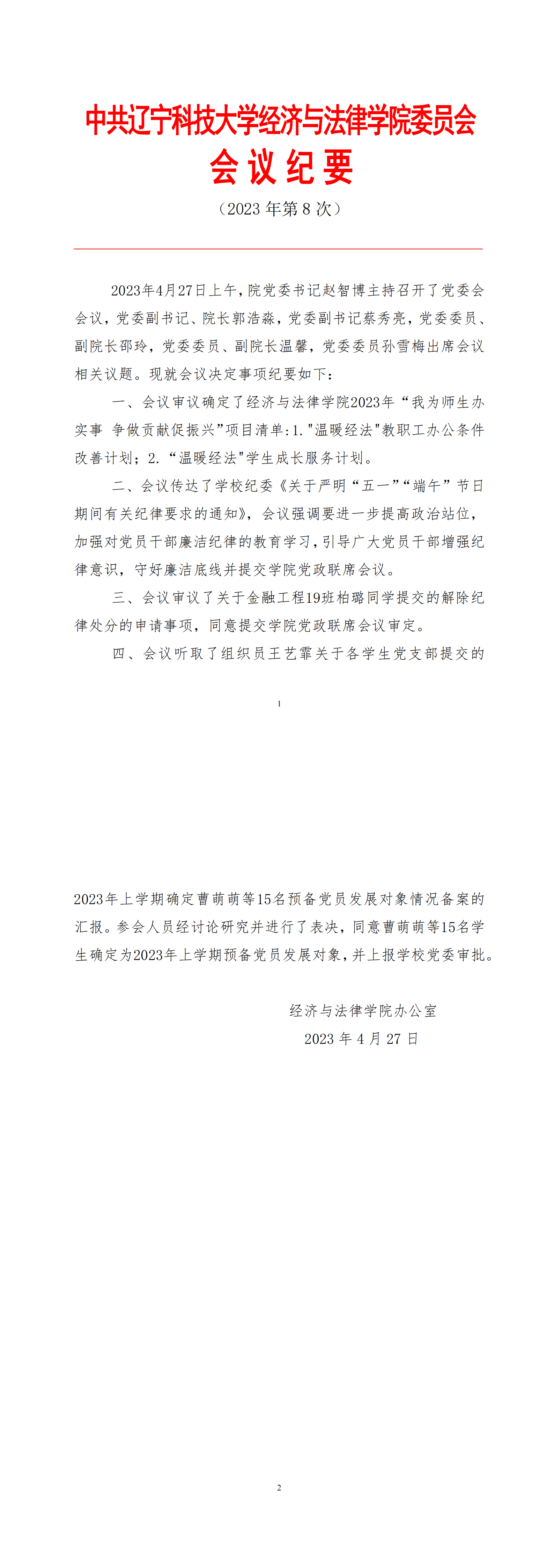 中共荣耀体育app最新版下载经济与法律学院委员会会议纪要(2023年第8次)