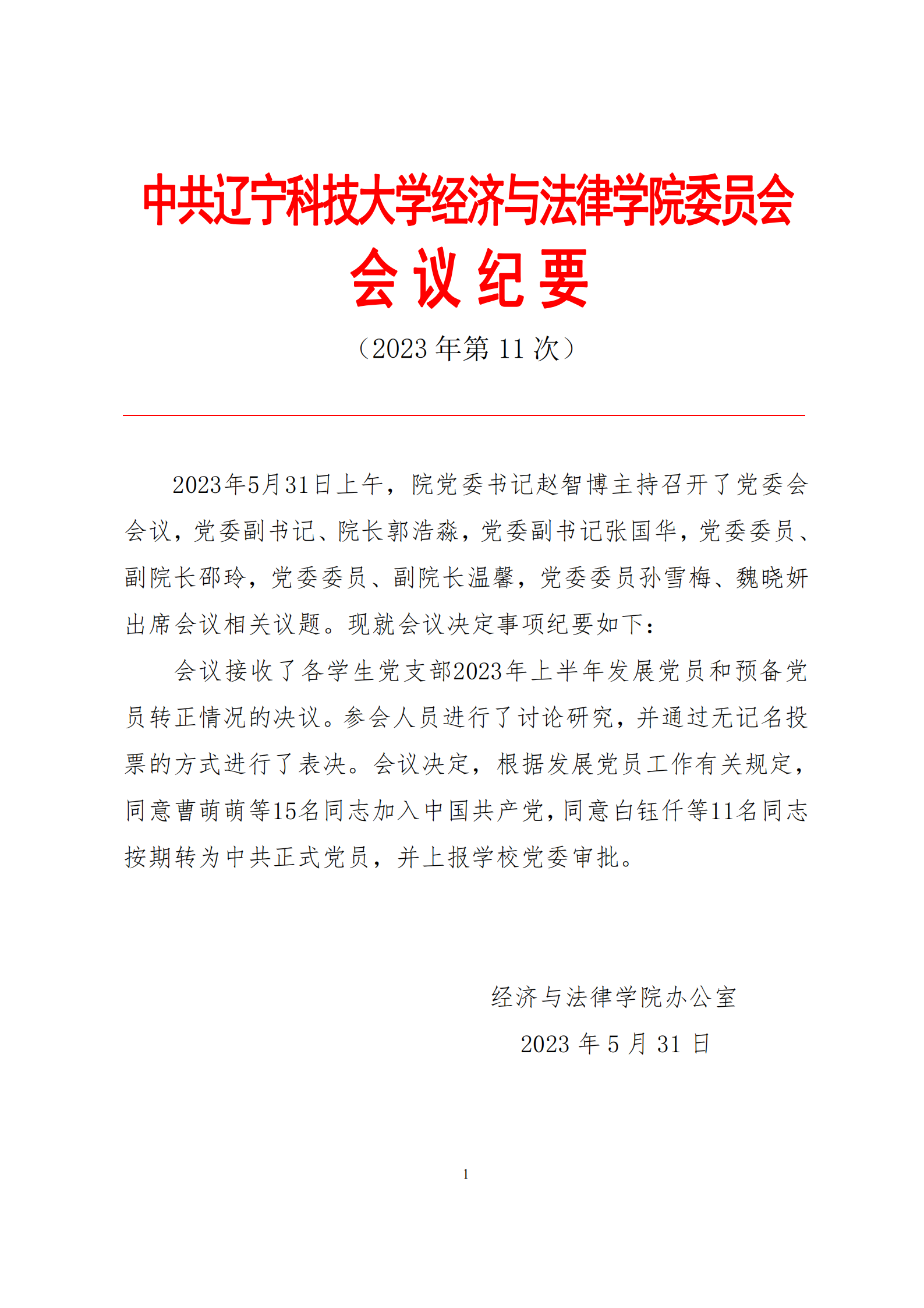 中共荣耀体育app最新版下载经济与法律学院委员会会议纪要(2023年第11次)