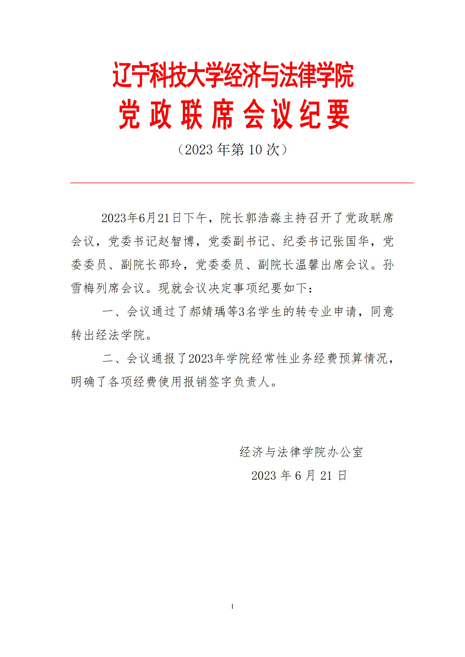 荣耀体育app最新版下载经济与法律学院党政联席会会议纪要(2023年第10次)