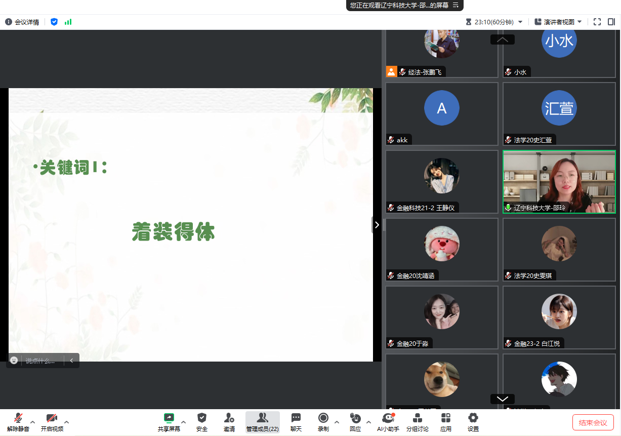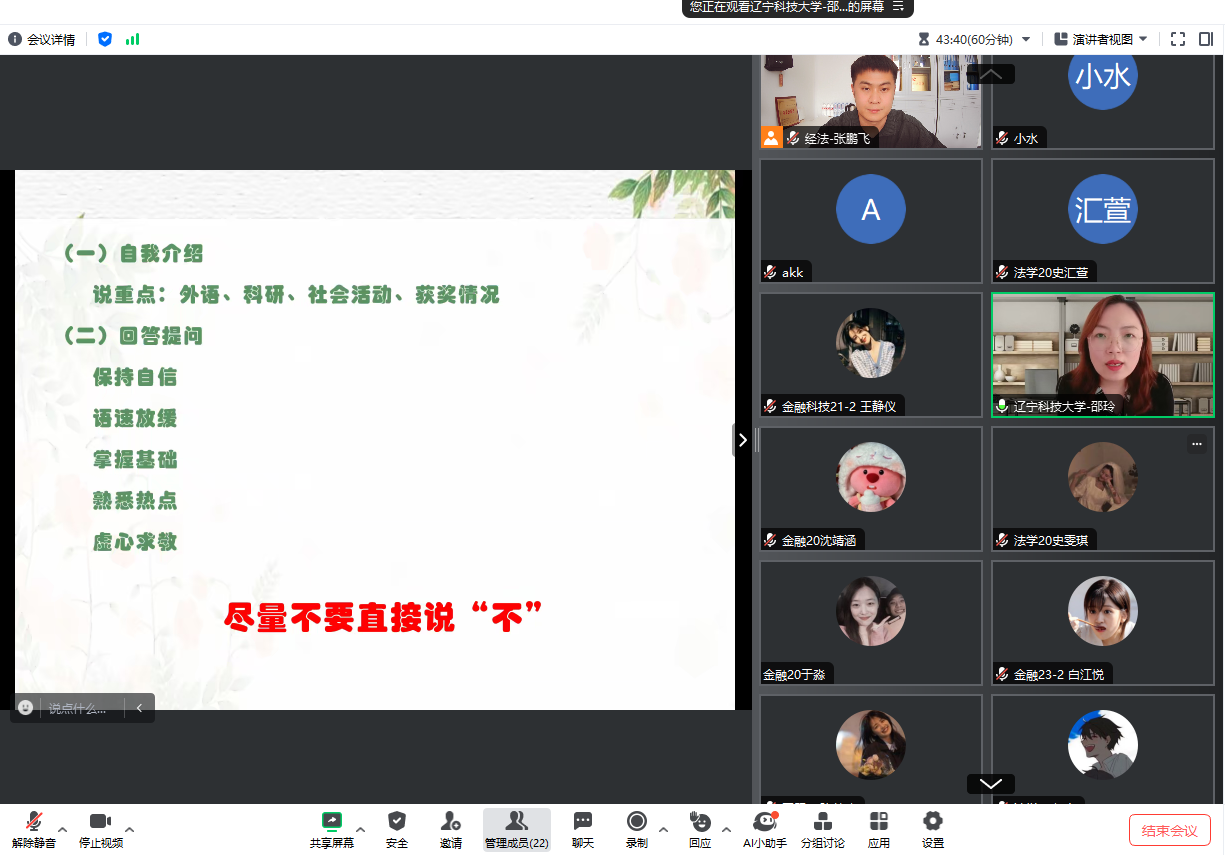 培训会上,邵玲从着装礼仪、答辩礼仪以及复试中常见的问题等多个角度为同学们进行了详细讲解。她深入剖析了复试考官的主要关注点,在着装得体、自我介绍技巧、回答提问策略以及时间掌控等方面进行了详细讲解,并结合生动的案例和实际经验,与考生分享如何更好地展现个人优势,提醒大家在面试过程中保持自信、礼貌、诚实和谦虚的态度,充分展现自己的综合素质,赢得考官的认可。她强调,面试不仅考查学生的专业知识和技能,更注重学生的综合素质和应变能力,鼓励大家以扎实的专业知识、良好的精神风貌、沉着冷静的备考心态迎接复试。毕业班辅导员张鹏飞希望同学们能够在此次培训中吸取宝贵经验,将其内化为适合自己的复试策略和备考方法,以更加勇敢和自信的姿态面对研究生复试挑战。同时表示,学院也将一如既往地为考研学子提供全方位的支持和保障,预祝大家一“研”为定、全力以“复”,旗开得胜。