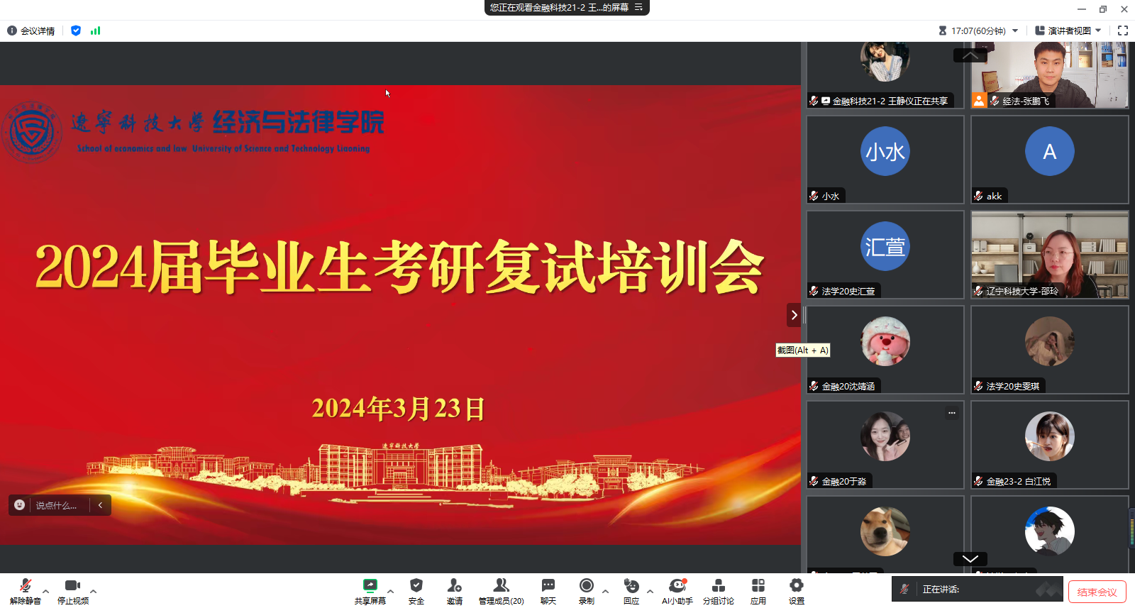 3月23日,经法学院于腾讯会议APP线上召开2024届毕业生考研复试培训会。会议由学院团委副书记、毕业班辅导员张鹏飞主持,会议邀请学院副院长邵玲担任主讲人,学院20名考研学子参加了会议。