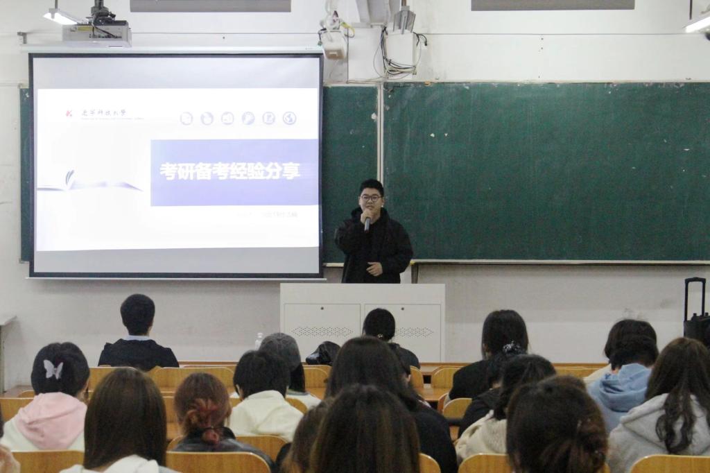 学院19级贾浩楠、唐文萍、王雨杰、王艺桥、张诗茹五位同学结合自身专业和备考经历分别从院校选择、复习计划、心态调整、学习方法等方面向同学们分享了自己的考研经验。他们提出选择和努力同样重要,“磨刀不误砍柴工”。他们鼓励同学们结合自身实际情况明确考研目标,有针对性地制定学习计划,选择合适的学习方法。