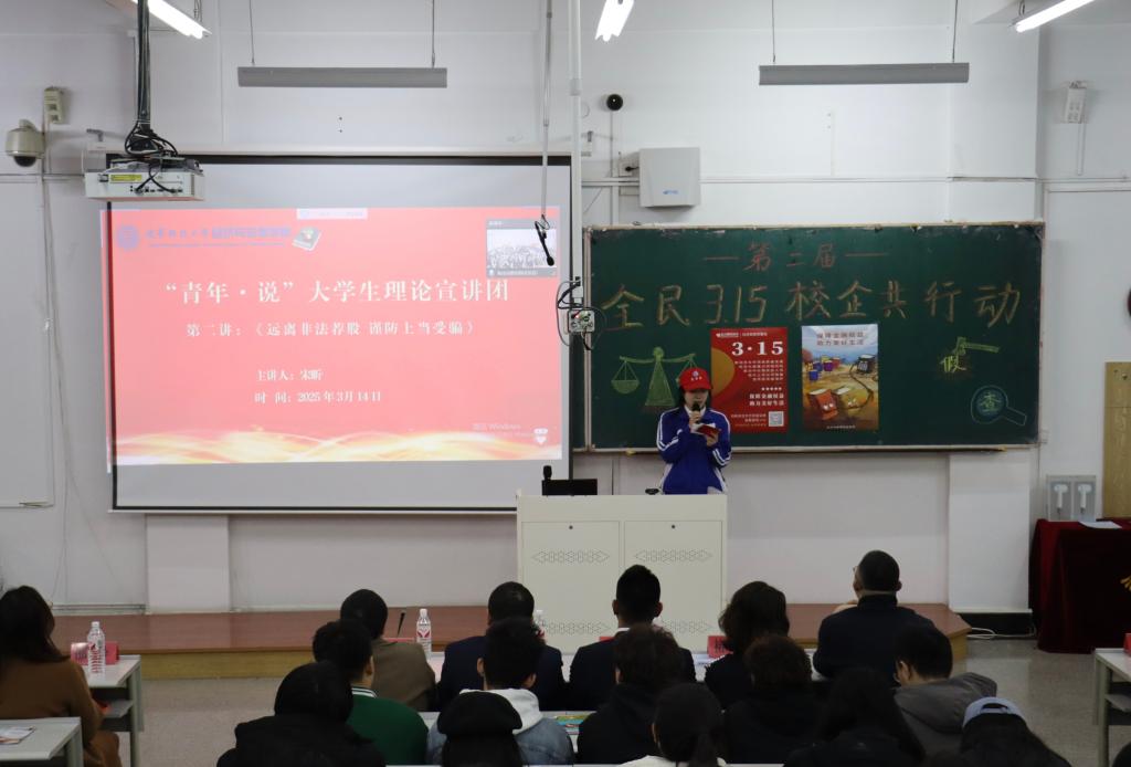 宣讲会上,宋昕以“远离非法荐股,谨防上当受骗”为主题,带领同学们掌握防范有关非法荐股的法律知识。她通过典型案例分析,揭露非法荐股的常见套路,警示大家不轻信“高收益、低风险”的虚假宣传,勿入“暴利”陷阱。从法律角度,她鼓励同学们运用法律武器保护自己的合法权益,莫贪小利吃大亏。