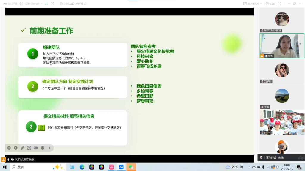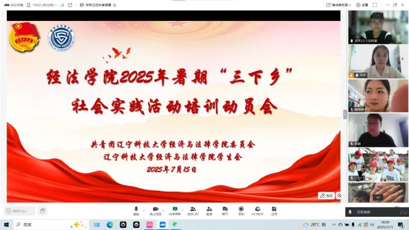 7月15日,经法学院通过腾讯会议APP召开暑期“三下乡”社会实践活动培训动员会,会议由学院团委实践与社团指导中心副主任宋昕主持,学院团委学生副书记兼实践与社团指导中心主任刘帅家及各支实践团队成员共计53人参加会议。