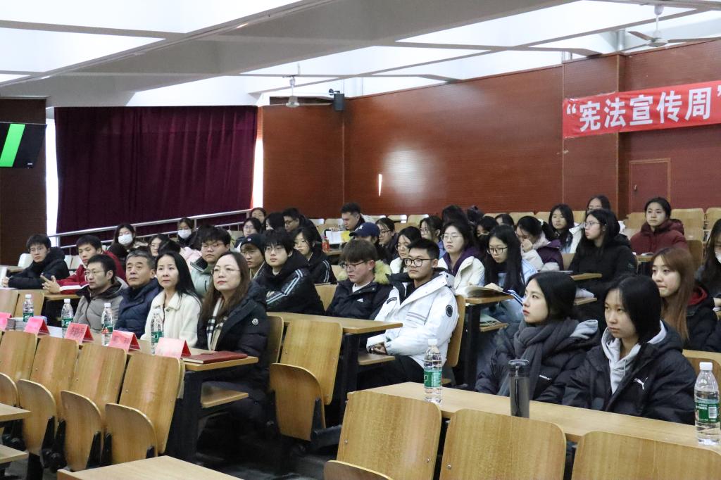 12月4日,经法学院与鞍山市法学会、市司法局于博识楼A402联合开展宪法日活动。本次活动由学院法律协会会长王一铭主持,鞍山市法学会、市司法局一行3人、经法学院副院长邵玲、法律系主任蒋喆出席,法学2023级和其他专业共60名学生参加。