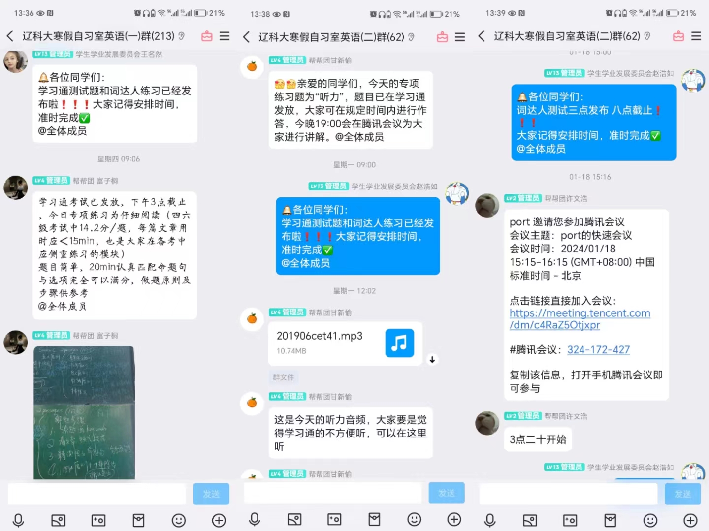 为了帮助同学们巩固课堂学习成果、提高假期学习效率,荣耀体育app最新版下载教务处大学生学业发展指导中心组织学生学业发展委员会举办了寒假线上自习室活动,1500余名同学从2024年1月15日至2024年2月21日期间在词达人小程序、超星学习通、QQ群、腾讯会议等活动平台,与学霸教员共赴学海,度过了一段充实且有意义的寒假时光。