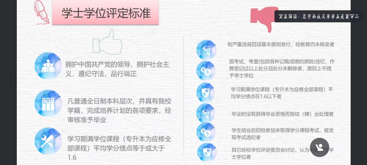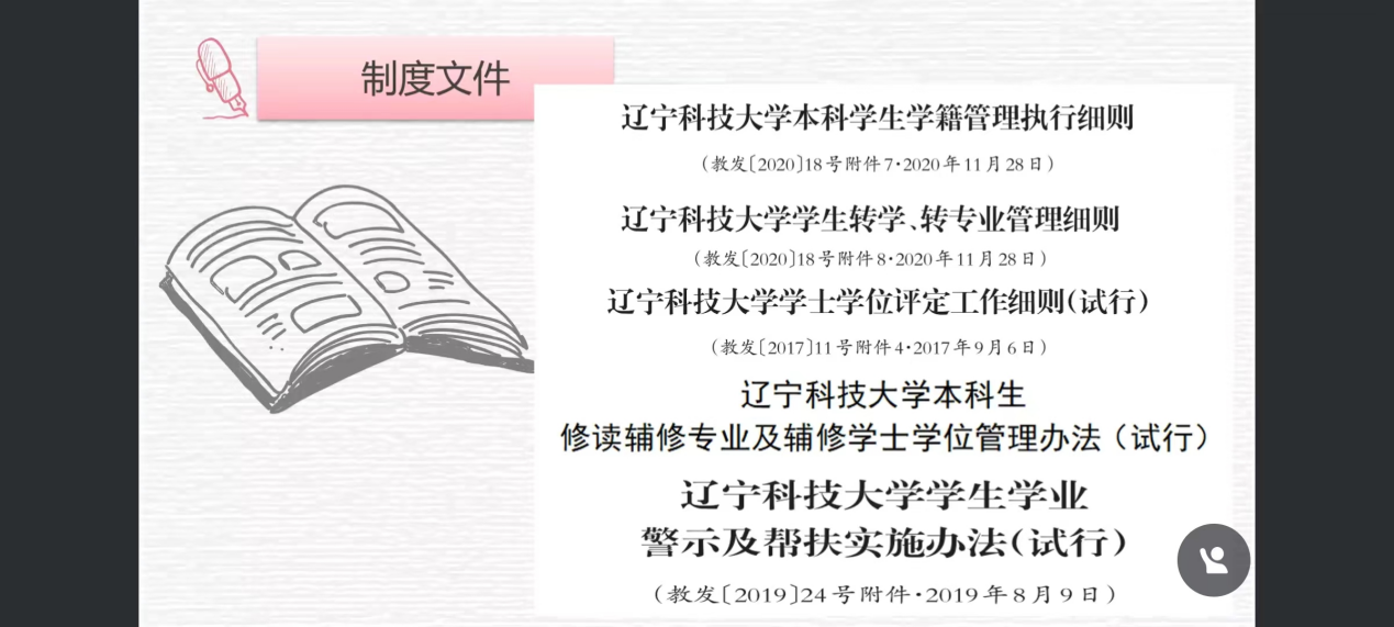 培训根据学生需求和关切,选取了《荣耀体育app最新版下载本科学生学籍管理执行细则》《荣耀体育app最新版下载考试工作管理规定(试行)》《荣耀体育app最新版下载大学生学业发展指导工作实施意见(试行)》等10个教学管理制度文件,重点围绕学籍学位、考试和选课、学业发展三大方面为学生进行制度解读,使信息员同学对学习过程中应知的相关管理规定和要求有更清晰的认识,以便为学生学业发展提供更好的支持和服务。