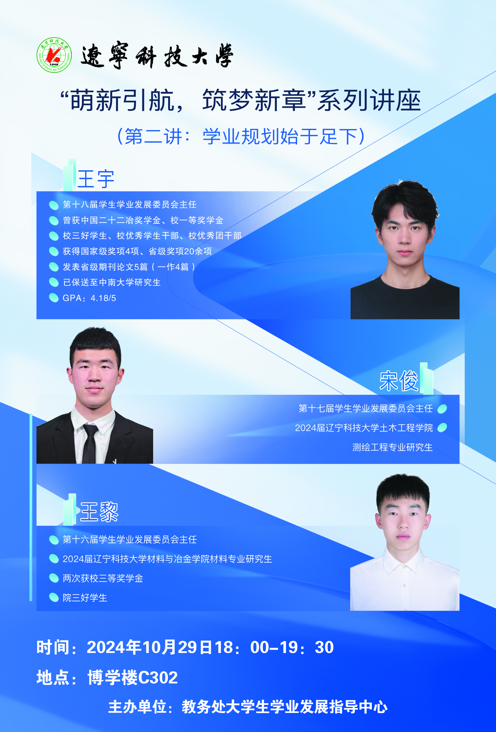 10月29日,教务处大学生学业发展指导中心面向2024级新生举办的“萌新引航,筑梦新章”系列讲座第二讲《学业规划始于足下》在博学楼C302教室开讲。荣耀体育(中国)学生学业发展委员会历届主任王宇、宋俊、王黎为学校300余名新生作讲座。