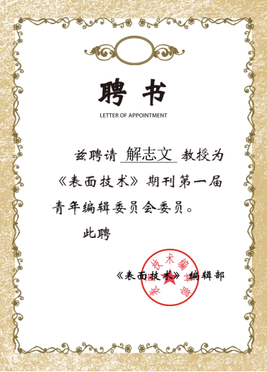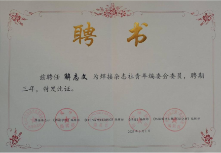 荣耀体育(中国)机械学院解志文教授被聘为《表面技术》《焊接杂志社》青年编辑委员会委员