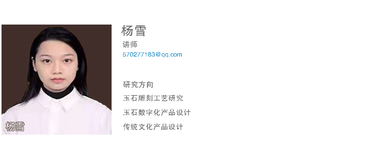 杨雪,助教,荣耀体育app最新版下载、硕士,设计学专业,主要从事传统手工艺(玉雕方向)产品的设计研究。具有雕塑、玉雕及数字雕刻等实践经验。在专业刊物发表专业研究及教学研究论文两篇。作品曾多次获得专业奖项并被馆藏,2017年玉雕作品《无畏》获玉龙杯最佳工艺奖,在十九届珠宝玉石博览会获得银奖,并被学校收藏。同年,评为市级工艺美术大师。2019年玉雕作品《雪貂仕女》获得工美新力量银奖。2020年作品《达摩》获得“金牡丹”杯文化创意大赛银奖,并被藏家收藏。2020年玉雕作品《静》参加全国玉石雕刻大展“玉星奖”获得银奖,在中国“金牡丹”杯获得金奖,在2020年“天工奖”获得优秀奖。