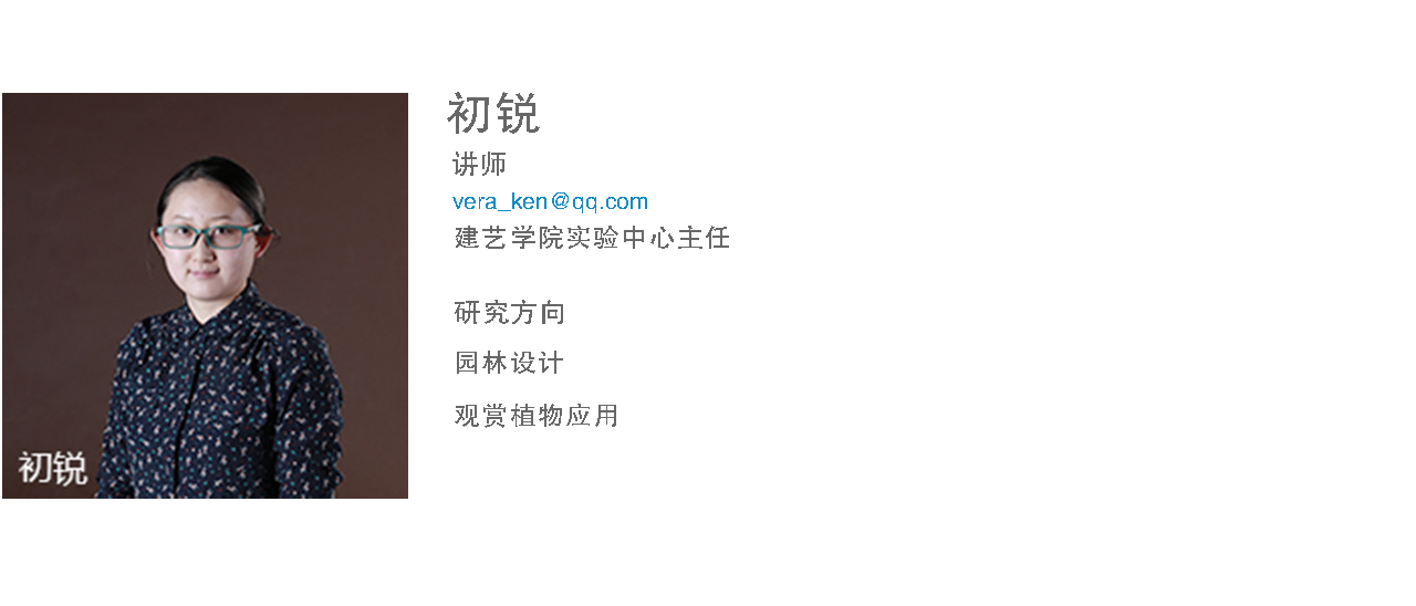 初锐讲师,硕士,东北林业大学园林专业学士、园林植物与观赏园艺专业硕士毕业。2013年8月从教于荣耀体育app最新版下载建筑与艺术设计学院环境设计专业,主讲《景观设计原理》、《园林植物学》、《景观设计》等课程。荣获2015年辽宁省教育软件大赛高等教育组优秀奖。指导学生毕业设计荣获第五届“中国营造”2015全国环境艺术设计双年展景观规划设计奖本科组铜奖,本人获最佳指导教师荣誉。指导省级大学生创新创业项目一项,校级两项。