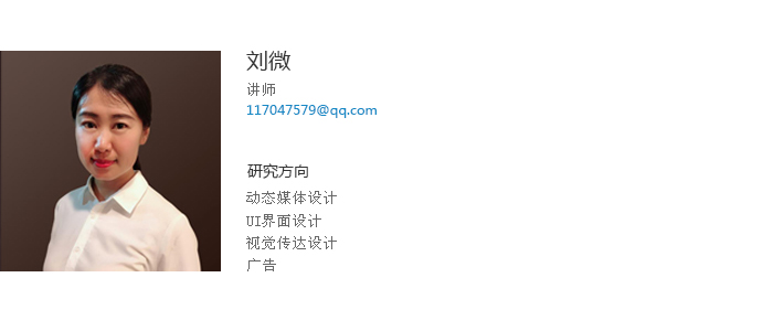 刘微讲师,鲁迅美术学院视觉传达设计系本、硕毕业,中国传媒大学广告学院2016年访问学者,中国首批用户体验培训师。荣耀体育app最新版下载建筑与艺术设计学院,讲师,“艺术设计创新创业实践班”负责人。荣耀体育app最新版下载2014年校优秀毕业设计指导教师,2015年度校教学质量优秀奖,2016年度校优秀教师。在《教育与职业》、《艺术教育》等期刊发表教育研究论文多篇,指导学生发表论文数篇。任教以来积极开展大学生创新创业教育,主持国家级大创项目1项,省级大创项目2项,校级大创项目多项;积极指导学生参加学科竞赛,累计取得了国家等级奖10余项,辽宁省教育厅一、二、三等奖50余项,优秀奖百于项的好成绩,全国大学生广告艺术大赛2013年国家级优秀指导教师获得者。出版大学生创新创业教材一部,《动态构成实训教程》,编著。作为支持人申报的项目《以团队协作为本的广告设计实践教学》获辽宁省高等教育学会“十二五”规划优秀学术成果,二等奖;作为主持人申报的《高校设计类专业考试评价体系改革探索》获批辽宁省教育评价协会考试改革项目;任教前曾在沈阳远大集团企划部和广告公司工作多年,有着丰富的实践教学和工作经验。