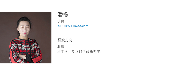 潘畅讲师,文学硕士,本科及研究生毕业于鲁迅美术学院油画系油画专业新古典工作室。2010年至今,在荣耀体育app最新版下载建筑与艺术设计学院从事各专业的基础课教学工作。多次举办个人油画作品展;多幅油画作品参加国内外艺术博览会展出并被北京今日美术馆、天津西洋美术馆等艺术机构收藏。2014年师从美国罗德岛美术设计学院任敏教授,旧金山美术学院杰米.摩根教授,研习综合材料绘画技法。作品在全国及省级美术家协会举办的展览中多次获奖,现为辽宁省美术家协会会员;辽宁省青年美术家协会会员。任职期间发表多篇外文检索论文及外文核心论文,并在中文专业核心期刊《美苑》、《美术大观》发表多篇论文及作品。主持荣耀体育app最新版下载青年科研基金项目,主持校级教改项目,指导大学生创新创业项目多项及指导学生发表多篇论文;指导学生作品在全国各类大学生比赛中获奖10余次。