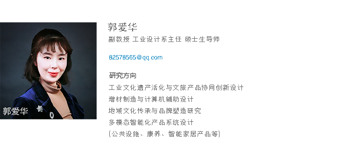 郭爱华,韩国庆一大学设计学博士,北京理工大学设计艺术学硕士(本硕博均工业设计专业)。曾获荣耀体育app最新版下载校级教学质量优秀奖两次;主持校级教改项目及教育科学研究课题共计十余项、省级教改项目主要完成人、主持及参与省校级教改成果奖一二三等奖共计十余项;曾获全国高校教师(本科)微课教学大赛辽宁省一等奖、全国多媒体课件大赛二等奖三等奖各一项、辽宁省教育软件大赛三等奖两项、校多媒体课件教学大赛一等奖、校优秀教案大赛一等奖二等奖;主编出版高等院校工业设计类“十二五”规划教材一部;主持中国科协青年智库成果、辽宁省社科联资助项目、辽宁省教育厅项目、鞍山市社科联项目等十余项;参与辽宁省自然科学基金项目、省精品资源共享课建设、省教育厅项目、市级科学计划项目等十余项;发表检索、核心论文多篇、教学研究论文多篇;授权实用新型专利和外观设计专利十余项;指导国家级省级大创项目若干、获校级大创年会一等奖两次二等奖一次;指导学生在A类学科竞赛中获一二三等奖若干、获辽宁省大学生工业设计大赛优秀指导教师。
