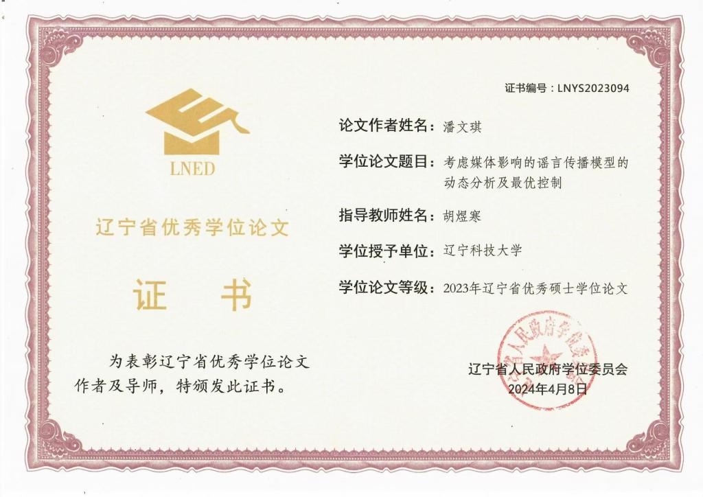 近日,辽宁省教育厅官网公布了2023年辽宁省优秀硕士学位论文评选结果,其中理学院由胡煜寒副教授指导的硕士毕业生潘文琪所撰写的论文《考虑媒体影响的谣言传播模型的动态分析及最优控制》,获评优秀硕士学位论文。这是继刘昊教授指导的硕士生张旭伟获评辽宁省优秀硕士学位论文之后,理学院第二次获此殊荣。