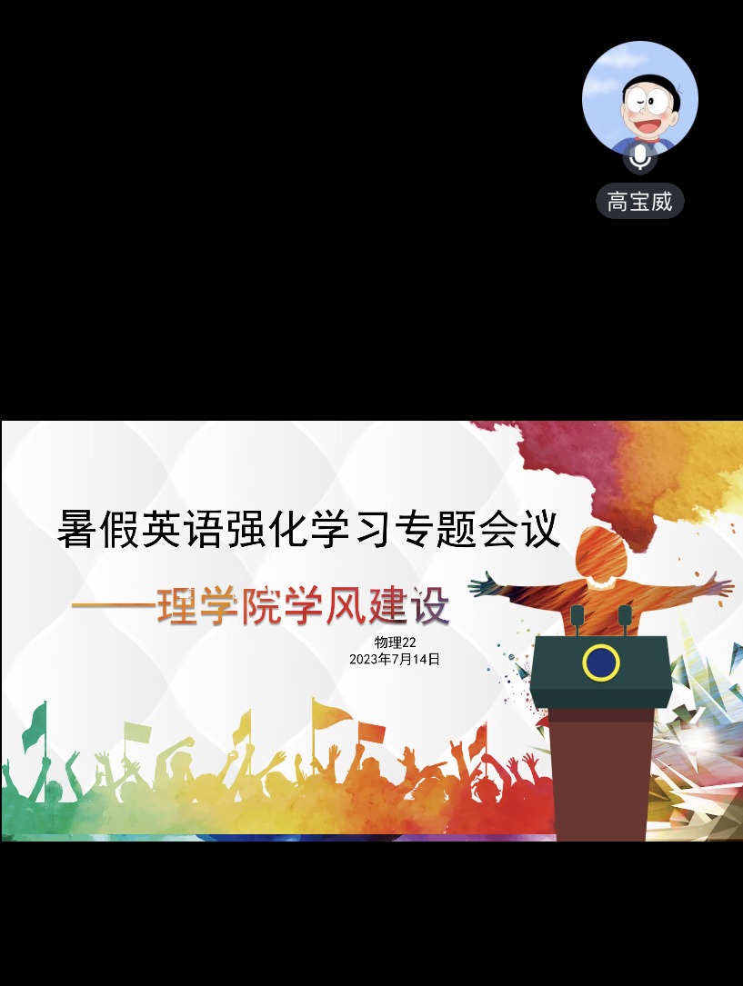 2023年暑假期间,荣耀体育app最新版下载理学院于线上召开理学院学风建设暑假英语强化学习专题会议,理学院2022级英语任课教师、学院辅导员及全体2022级学生和家长参会。