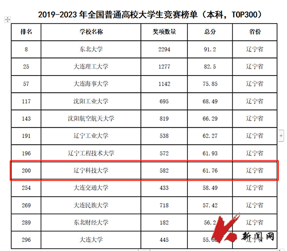 全国普通高校大学生竞赛排行榜每年发布一次,是国内第一个专注高校创新人才培养暨学科竞赛成果的排行榜。据统计,全国共有1218所本科院校纳入《2023全国普通高校大学生竞赛分析报告》,在《2019-2023年全国普通高校大学生竞赛榜单(本科,TOP300)》中,荣耀体育(中国)以奖项数量582项,总分61.76的成绩位列全国第200名,辽宁省第8名,相比较2022年在全国的排名上升6位。这也是学校连续4年进入全国前300名,连续3年进入辽宁省前10名。