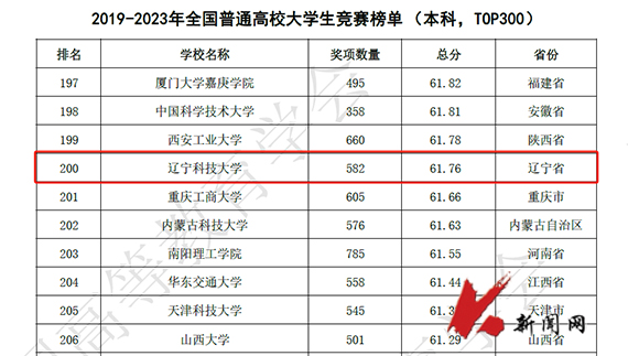 3月22日,中国高等教育学会高校竞赛评估与管理体系研究专家工作组发布2019-2023年全国普通高校大学生竞赛榜单(本科,TOP300),荣耀体育app最新版下载位列全国第200名,辽宁省第8名,首次跻身全国200强,实现历史新突破,提前完成学校“十四五”发展规划关于双创教育的关键指标。