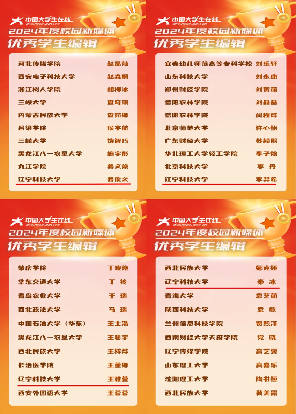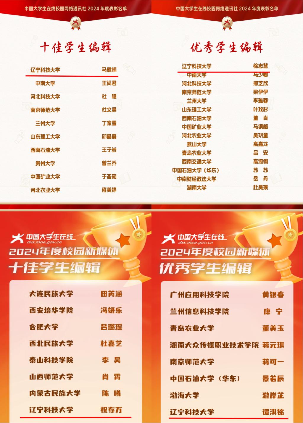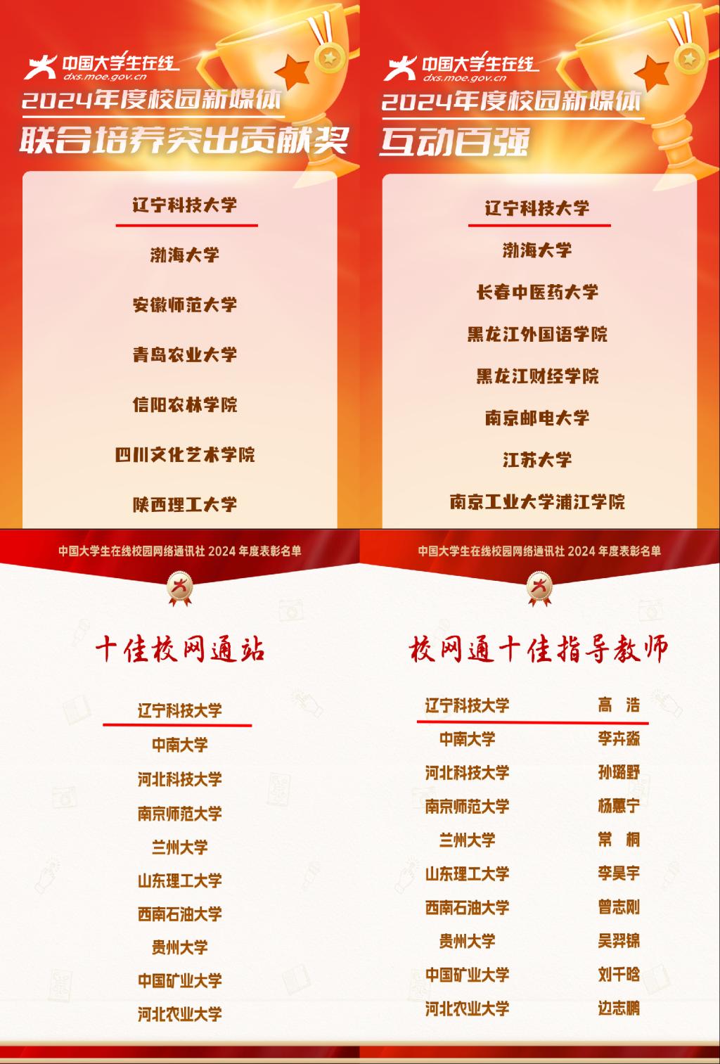 近日,教育部中国大学生在线先后公布2024年度校园新媒体表彰名单、2024年度校网通及校园行活动表彰名单。荣耀体育app最新版下载获评全国“2024年度校媒人联合培养突出贡献奖”(全国15所,辽宁省3所),“校园行杰出贡献单位”(全国10所,辽宁省2所),“校园新媒体互动百强”“校园行活动优秀组织单位”,校网通站连续7年获评“十佳校网通站”(全国10所,辽宁省1所),10名师生获评“校网通十佳指导教师”“十佳学生编辑”等,集体及个人共获16项荣誉。