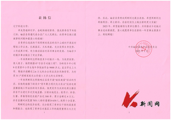 表扬信中表示,岫岩县岭沟乡山城村驻村第一书记兼驻村工作队队长周彬同志能够扎根基层、无私奉献,充分发挥自身优势,工作成果丰硕,有力推动了派驻村各项事业发展。其优异表现充分体现了学校对基层工作的高度重视与大力支持,希望学校与岫岩县继续携手,共同推动乡村振兴事业迈向新高度。