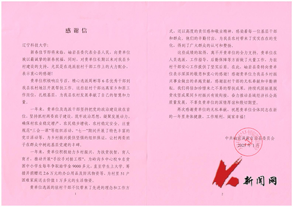 感谢信中表示,学校选派的6名驻村干部坚持把党的政治建设放在首位,坚持抓村两委班子建设,带来了先进的理念和工作方式,其辛勤付出为岫岩县乡村带来了实实在在的变化,得到了广大群众的认可和赞扬。岫岩县将倍加珍惜帮扶成果,持续巩固拓展脱贫攻坚成果同乡村振兴有效衔接,不辜负学校的深情厚谊和殷切期望。