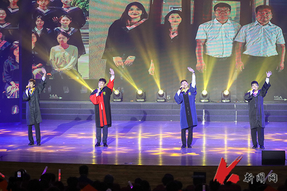本次文艺展演分为弦歌不辍和踏浪逐光两个篇章。被喻为“时光标本”的《光阴的故事》,以经典的旋律激荡起观众的情感共鸣;婉转空灵的小合唱《世界赠予我的》,唱出了对视世界的哲学思辨和对毕业生的美好祝福;创意秀《青花瓷》采用全息投影技术,呈现中华优秀传统文化的意境之美;街舞《吒界智舞》通过AI技术将哪吒请到了荣耀体育(中国)舞台,为观众带来视觉震撼;诗朗诵《后会有期》情感真挚,真切表达了对同窗的不舍、对恩师的感激和对母校的情谊;《毕业歌》曲调悠扬,台上台下毕业生互动挥手,共同致敬如火一般的青春时光;文艺展演在气势磅礴、振奋人心的歌曲《乘风破浪再出发》中走向尾声。