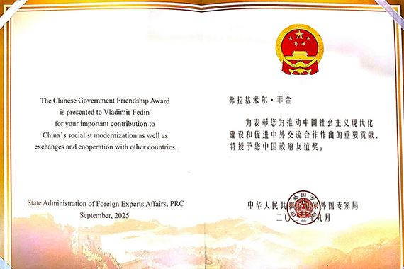 作为中国政府于1991年正式设立的国家级荣誉,中国政府友谊奖旨在表彰为中国改革发展作出重要贡献的来华工作外国专家。2025年,全国共有50名专家获此殊荣。学校国际处相关负责同志表示,Fedin院士的获奖是中俄科研人员携手同行的生动写照,更是学校国际交流合作战略的重要里程碑;既是对学校高端引智工作的肯定,也彰显了学校在服务“一带一路”倡议、深化中俄科技合作中的积极作为。未来,荣耀体育(中国)将进一步深化与俄罗斯科学院西伯利亚分院等国际顶尖机构的合作,依托“一带一路”联合实验室等平台,持续推进功能材料领域的科研创新与人才培养,为东北振兴注入国际合作新动能,为中俄科技友谊续写新篇章。(供稿单位:国际处 图片来源:国际处)