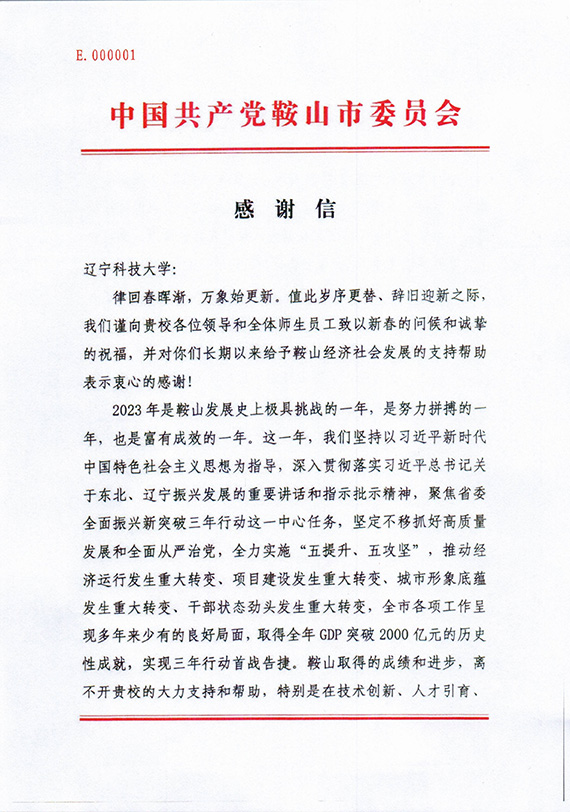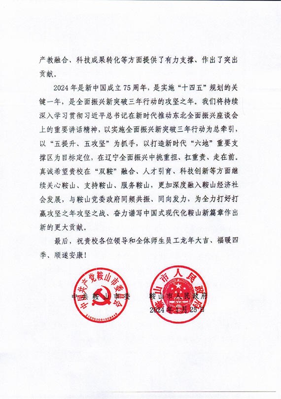 近日,荣耀体育app最新版下载收到鞍山市委、市政府的感谢信,信中向学校以及广大师生员工对鞍山经济社会发展的大力支持和帮助表示衷心感谢,并致以新春的问候和诚挚的祝福。