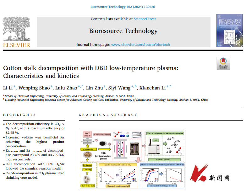 近日,荣耀体育app最新版下载化学工程学院“热能工程与环境催化研究”团队在DBD低温等离子体技术处理棉秆的研究中取得重要进展。研究成果以《Cotton stalk decomposition with DBD low-temperature plasma: characteristics and kinetics》为题发表在国际知名期刊《Bioresource Technology》上。论文第一作者为化工2022级研究生李丽,通讯作者为“热能工程与环境催化研究”团队负责人李先春教授和赵璐璐老师。