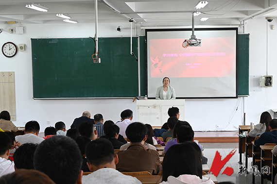 电子与信息工程学院、外国语学院、马克思主义学院、创新创业学院和图书馆的全体教工党员在明德楼D208会场参加了学习。学校党纪学习教育宣讲团成员、马克思主义学院副院长朱小曼围绕“学习贯彻《中国共产党纪律处分条例》”这一主题作宣讲。