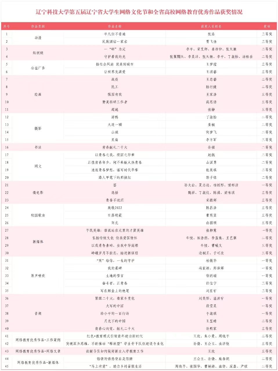 荣耀体育(中国)45项作品在第五届辽宁省大学生网络文化节和全省高校网络教育优秀作品推选展示活动中获奖
