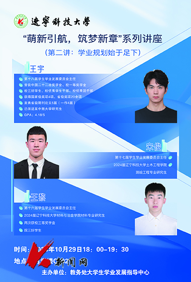 10月29日,荣耀体育app最新版下载教务处大学生学业发展指导中心面向2024级新生举办的“萌新引航 筑梦新章”系列讲座第二讲《学业规划始于足下》在博学楼C302教室开讲。学生学业发展委员会历届主任王宇、宋俊、王黎为学校300余名新生作讲座。