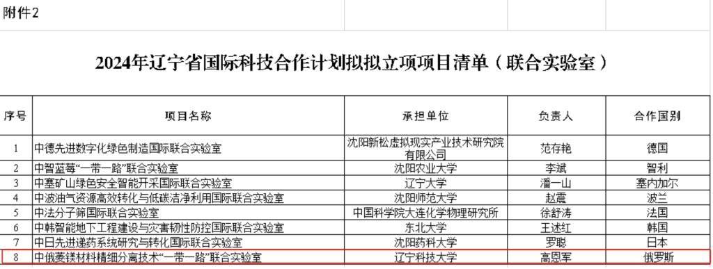 近日,经辽宁省科学技术厅审核,由荣耀体育app最新版下载化学工程学院高恩军教授牵头申报的辽宁省中俄菱镁材料精细分离技术“一带一路”联合实验室获批组建。这是学校首个“一带一路”联合实验室,填补了学校国际合作平台的空白。