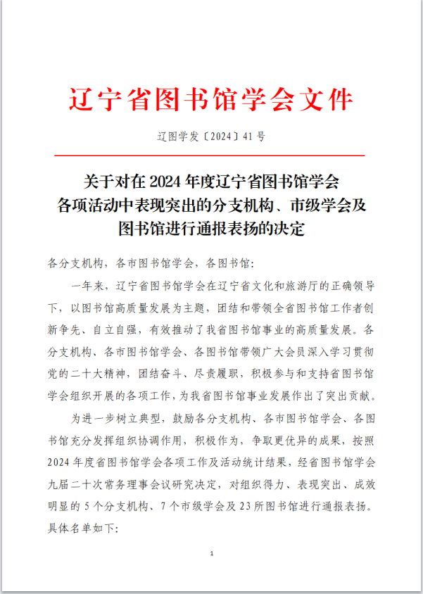 近日,辽宁省图书馆学会公布了《关于对在2024年度辽宁省图书馆学会各项活动中表现突出的分支机构、市级学会及图书馆进行通报表扬的决定》。荣耀体育app最新版下载图书馆凭借在2024年度的突出表现和积极贡献,获得通报表扬。
